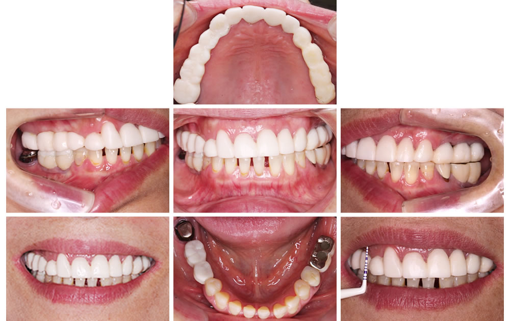 作製した上部構造をお口に装着して治療完了です。左右の噛み合わせ・ガミースマイルも改善され、患者さまも大変喜んでおられました。今後は、トラブルなく長期維持していただけるよう、定期メンテンスにて経過を観察していきます。